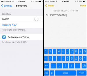 BlueBoard 並不會在整體外觀帶來巨大變化,它只是為你平淡無奇的鍵盤增添一絲新意。目前,這款 BlueBoard 插件在 BigBoss 庫中免費上架,支持 iOS 7 或更高版本設備。如果你不喜歡藍色,在越獄社區中同樣可以找到其他類似效果的插件。Bloard 就是另一款同樣簡單的免費插件,它可以使 iOS 7 鍵盤變成黑色。如果你還想尋找更多的自定義顏色,那就看看專為 iOS 7 鍵盤推出的完整色彩的插件 Fancy。