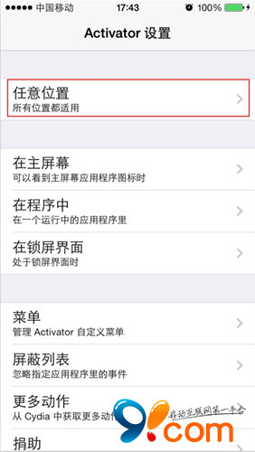 1.進入設置——activator——任意位置——沿屏幕右側拖動 從上向下拖動——模擬按下home。