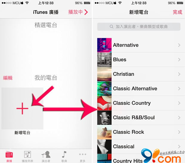 第一步要先「新增電台」,然後從 iTunes Radio 中選擇想聽的「音樂類型」,有藍調、流行、精典、鄉村、饒舌或 R&B,看你喜歡聽什麼類型的音樂,能同時選擇多種類型加入自己的電台清單裡。