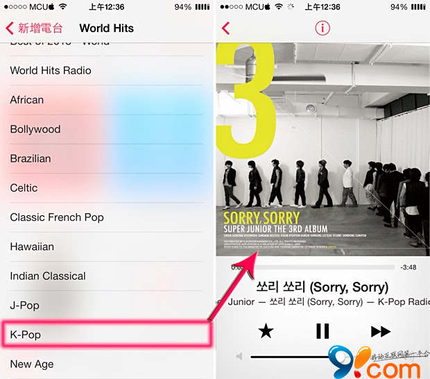 像我選擇「K-Pop」電台,iTunes Radio 第一首就推薦我 Super Junior 的搓手歌 Sorry Sorry。雖然沒特別喜歡,不過旋律很熟悉蠻順耳的。