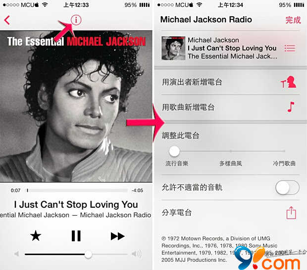 在歌曲播放畫面點擊上方的「i」符號,就能進入該電台的設定界面。你能用歌手或歌曲來新增電台,就能找到更多麥可 (喜愛歌手) 的音樂電台和歌曲。