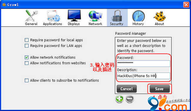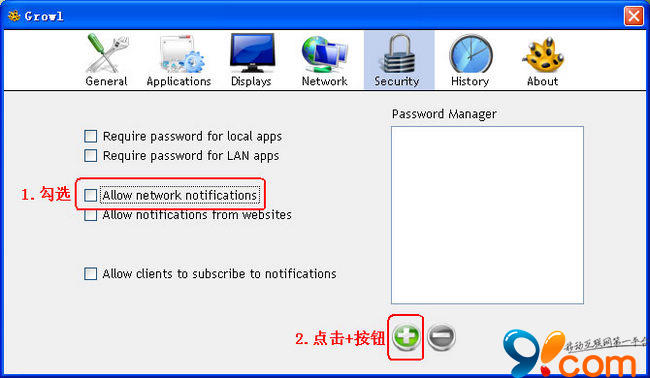 3.點擊Security選項卡。首先,勾選”Allow Network notifications”復選框,以確保程序可以收到來自網絡的推送。然後點擊下面的添加按鈕,增加密碼和描述,注意,密碼是必須的!