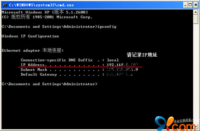 在彈出的”命令提示符”程序框中,輸入命令”ipconfig”,並按回車。查看出現的一列文字中,請牢記”IP Address”對應的數值。