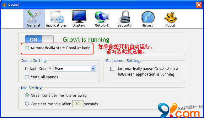 首先,如果你希望這個程序開機自動運行,請在General選項卡中,勾選”Automatically start Growl at login”復選框。否則,不必勾選。