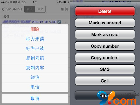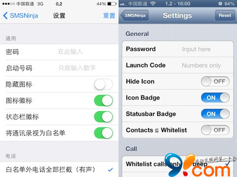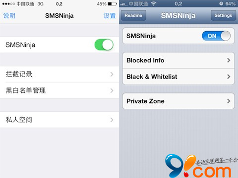 在國內這種個人信息洩露,垃圾內容泛濫的形勢下,一款短信或者電話攔截工具俨然在各平台上都成了裝機必備。SMSNinja是一款短信/彩信/iMessage/電話/FaceTime過濾/攔截軟件,支持全系列越獄過的iPhone,iOS 5~7,支持號碼、關鍵詞、時間段等多種過濾方式,支持通配符,支持黑/白/私人名單,支持來信聲音+震動提示,支持小圖標顯示攔截數量且極大地簡化了界面和設置方式。新版已全面適配iOS 7。以下圖片為SMSNinja在iOS7與iOS6不同系統中的展示界面。