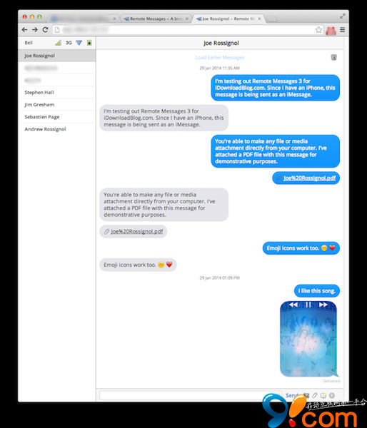 事實上,除了可以發送iMessage,也支援發送普通短訊。也可以發送附件、從iPhoto訪問相冊,可保存草稿及搜索訊息等等。不過使用Remote Messages需要iPhone與電腦連接到同一個Wi-Fi網絡,然後通過浏覽器便可使用Remote Messages。建議使用 Chrome、 Safari、 Firefox 和 Internet Explorer 9 以更高版本的浏覽器。