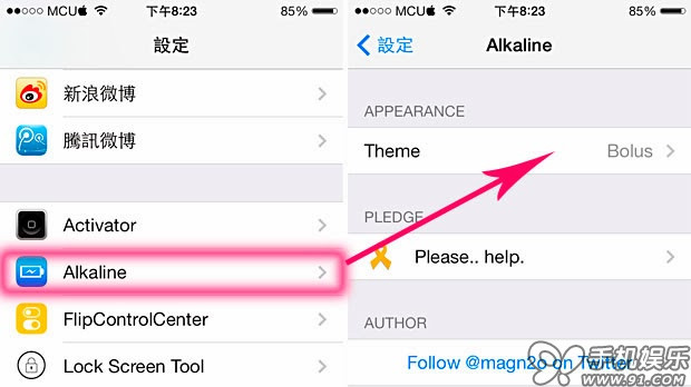 安裝後到「設置 > Alkaline > Theme」裡。