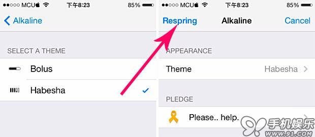 內置 Bolus 和 Habesha 兩款樣式電池圖標,選好後返回上一頁,點左上角的 Respring 注銷,重新啟動主屏幕就能套用了。