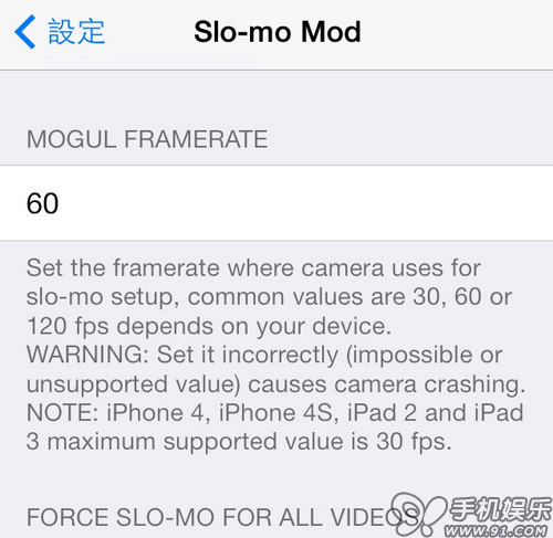 細節設置則是在設置 → Slo-mo Mod 裡面設定,不過要注意!雖然我們可以自由的設定 FPS ( Frame per Second:每秒播放多少影格 ),但是目前若是設定在 120 fps 的情況下進入相機就會閃煺,這是因為受到先天性的硬件限制,只有iPhone 5s支持120 fps,而iPhone 5就稍降一級至60 fps,再舊的裝置例如 iPhone 4、iPhone 4S、iPad 2 以及 iPad 3 的用戶則是最高只能設定至30 fps。
