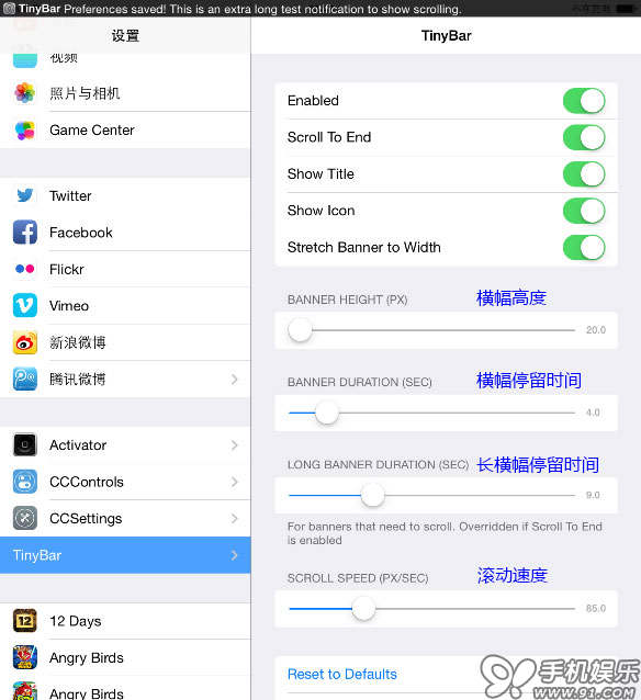 插件不僅可以將橫幅縮小到狀態欄顯示,還可以自定義通知顯示的時間和滾動速度。插件生效後,默認的橫幅變縮小到狀態欄,不再阻擋應用的內容。