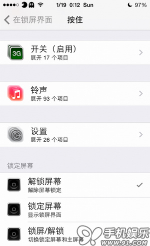 2.點進去 在鎖屏界面,電源按鈕,按兩下,按住,與主屏幕按鈕一起按,長按 這四個選項要點進去分別進行設置!
