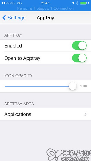 安裝 Apptray 後,可前往“設置”找到“Apptray”來添加你想放到通知中心的應用程序。你還可以調節在通知中心的應用圖標透明度,也能在設置中禁用或開啟 Apptray。為了保證設備的隱私安全,Apptray 不允許用戶從鎖屏界面的通知中心運行應用,雖然在鎖屏界面下拉通知中心能看到應用的圖標,但點擊圖標一點反應也沒有,這不是 bug,是開發者的設計。