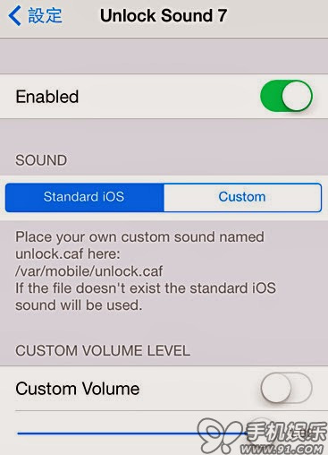 安裝後到“設置>UnlockSound7”裡,除了能選擇要不要開啟解鎖聲外,在下方的SOUND 還能 Custom 自定喜歡的解鎖聲音。只要把文件名取為unlock.caf 的聲音文件,上傳到 iPhone 的“文件系統 / var / mobile”裡,就能使用自定的解鎖聲音了。