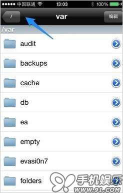如果打開iFile以後,當前目錄不在系統的 / 根目錄下,請點擊左上角按鈕返回,直到退回到系統的根目錄下: