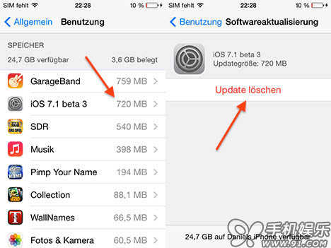 在最新的iOS7.1 beta3版本中,用戶終於可以刪除這些自動下載的升級包了。只要進入設置、通用、用量一項中會看到720MB大小的升級包存在其中,只要按一下刪除就可以騰出空間了。