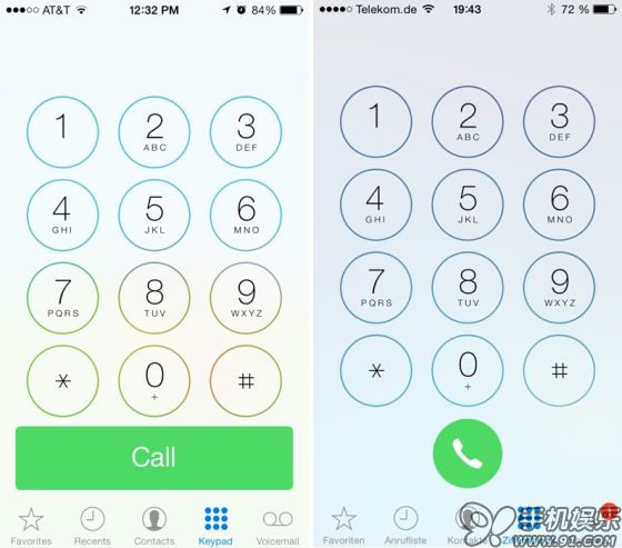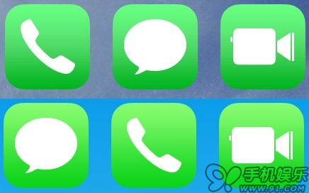 圖標:通話、消息和FaceTime應用的綠色圖標色調被調暗,尤其是在圖標底部。這減小了iOS7帶來的“霓虹般”感覺,操作系統某些部分的亮度也被下調。