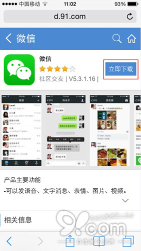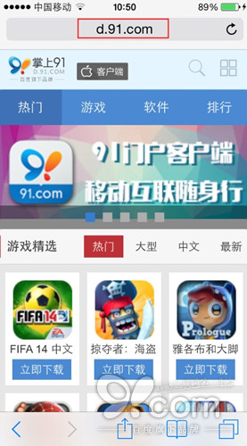 第一步.打開safari浏覽器,在網址輸入欄上輸入d.91.com,點擊“前往”,即可進入軟件游戲下載頁面,豐富的應用資源任君采撷。
