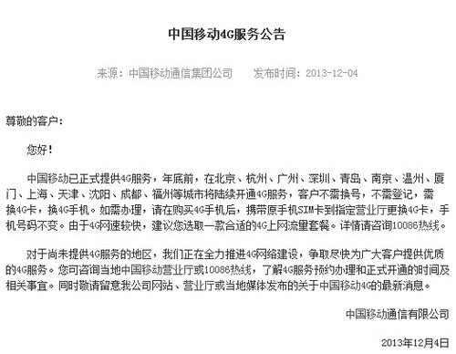 在頒發牌照後,中國移動迅速在其官網上發布公告,在年底前,北京、杭州、廣州、南京、溫州、上海、天津、成都、福州等城市將陸續開通4G服務,用戶只需更換4G卡及手機,無需換號,不需登記。