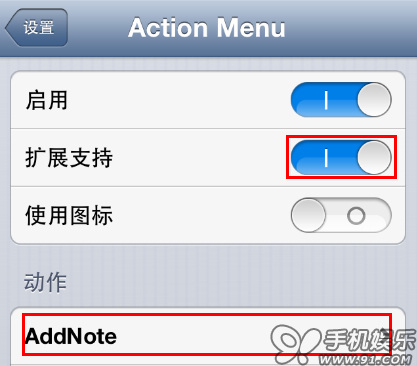 安裝後無需特別設置直接使用,不過要確保你的 Action Menu裡“擴展支持”選項是開啟狀態,打開 設置 ->AddNote for ActionMenu可查看狀態。