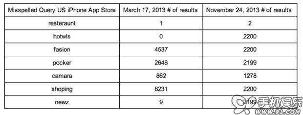 開發人員Sarah Perez指出,近日發現App Store對於關鍵字的的搜尋結果更加精准,一些輕微的打錯字也可以正確的找到該App。他舉出了一些例子,像是熱門的“QuizUP”,之前如果大家打“Quiz Up”是找不到或出現其他的搜尋結果,現在引擎改善後就可以正確地找到了。