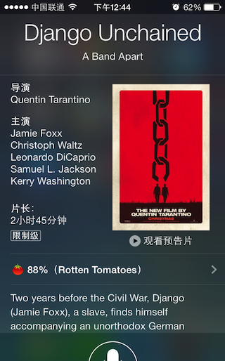 比較可惜的是,在中文中使用的時候,由於電影名稱在英漢互譯資料上的不完全,讓我們會感覺有些水土不服。你說漢語電影名稱吧,資料庫找不到,你就只能說英文的片名了,中英結合Siri絕大多數情況下聽不懂。可能這個功能也在不斷改進中吧,大家可以自己試試