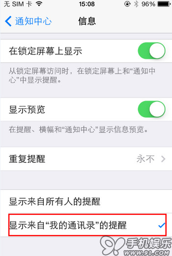 另外,iOS還可以通過“設置”→“通知”→“信息”裡點選“僅我的通訊錄”,以後只有收到你通訊錄裡聯系人發過來的信息能會有通知提示,這樣也算是另外一種防騷擾的小方法了,這個功能不限iOS7哦,沒升級的朋友也適用。