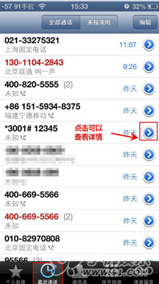 如需要查找通話記錄,可以輕觸“最近通話”進入查看,這裡顯示來電和去電信息,未接來電為紅色;你也可以直接點擊某條記錄,撥打給對方。