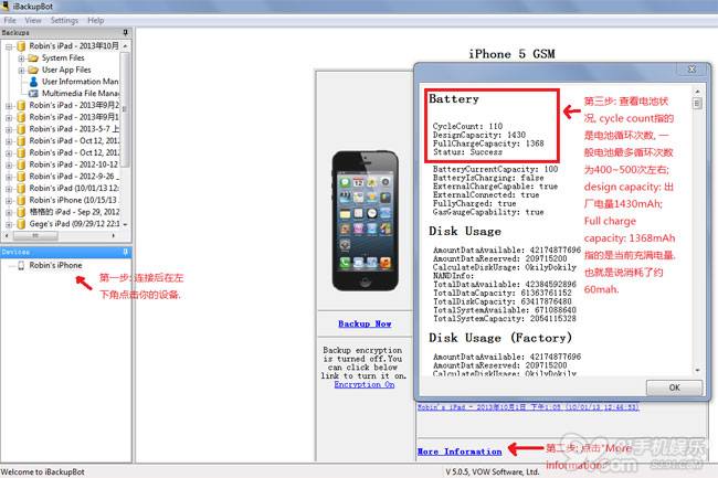 如何使用iBackupBot查看電池電量消耗及循環次數狀況,具體操作如圖所示(可點擊查看大圖)