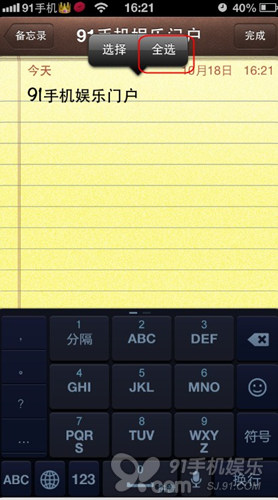 1.以備忘錄應用為例,首先打開備忘錄,輸入一段中文,點擊選中剛剛輸入的文字,會彈出菜單