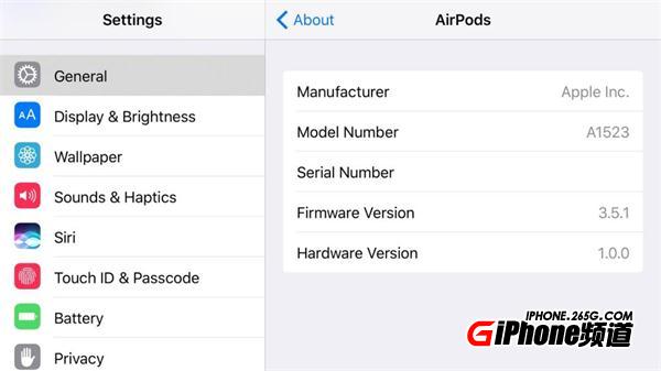 在“關於”頁面一直向下,你應該就會看到新的“AirPods”選項。在這裡你可以點擊菜單並查看關於 AirPods 的更多詳情和信息,包括生產商、型號、序列號、固件版本和硬件版本。