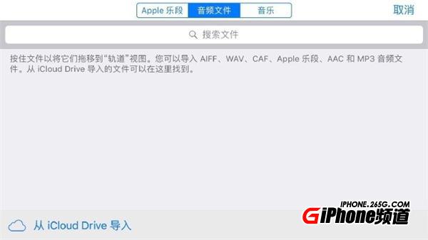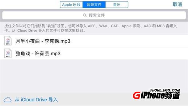 按右上角圓圈進入文件選擇,選擇中間音頻文件,按左下角“從iCloud Drive”導入,音樂就自動導入手機,按住音樂文件開始編輯(必須提到的是