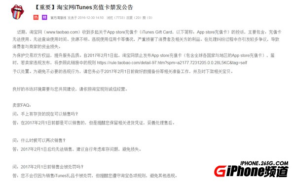 在去年12月底,淘寶曾發布公告稱將於2017年2月1日起全面禁售 iTunes 充值卡,稱大多數充值卡來源不明,有可能會損害買家的信息安全,同時也容易導致買賣雙方產生糾紛。