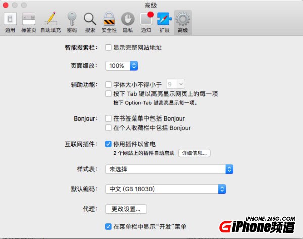 1. 首先在 Mac 設備中打開 Safari 浏覽器,然後在“偏好設置”中找到“高級”標簽,勾選最下方的“在菜單欄中顯示開發菜單”,然後我們就會發現菜單欄中多了一個“開發”選項。