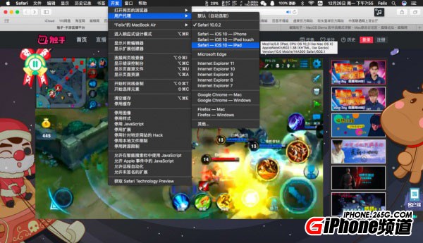 2. 隨便打開一個視頻網頁,然後選擇“開發 - 用戶代理”,勾選“Safari - iOS 10 - iPad”,然後我們可以看到,Mac 上的 Safari 網頁變成了 iPad 的加載模式。
