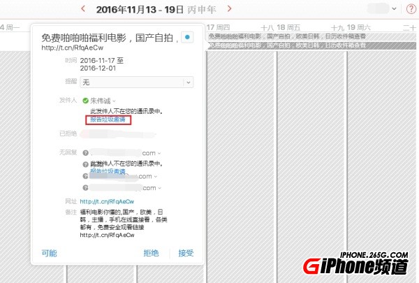 3.找到想刪除的垃圾邀請,雙擊它並點擊“報告垃圾邀請”鏈接,即可輕松刪除,並將發送人的信息上傳至蘋果官方進行調查