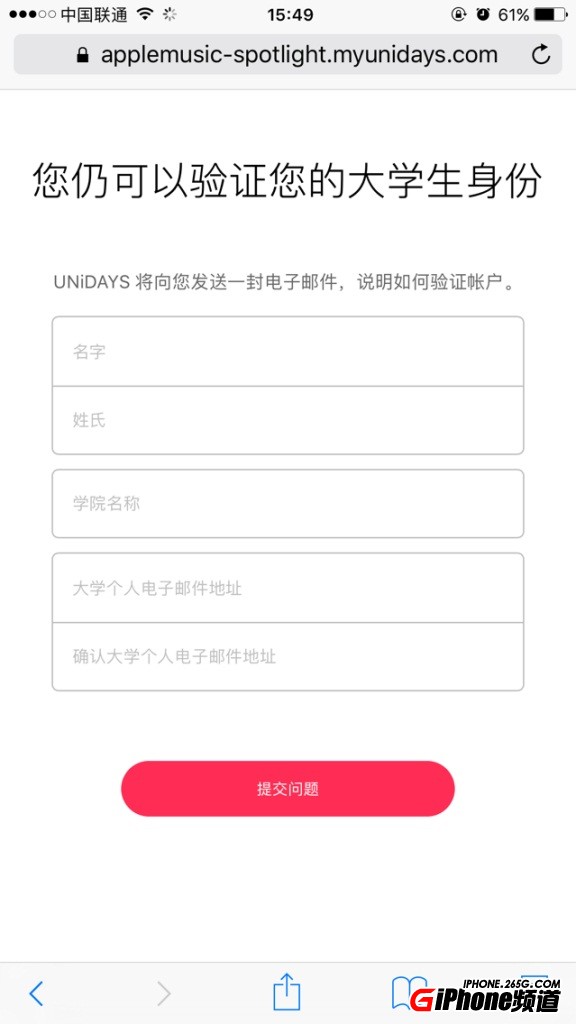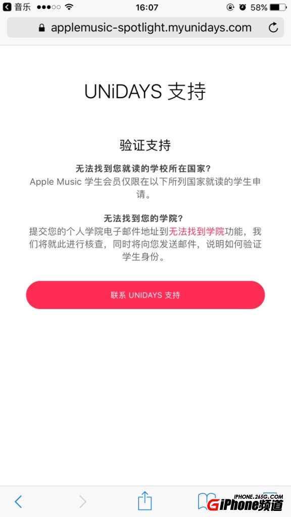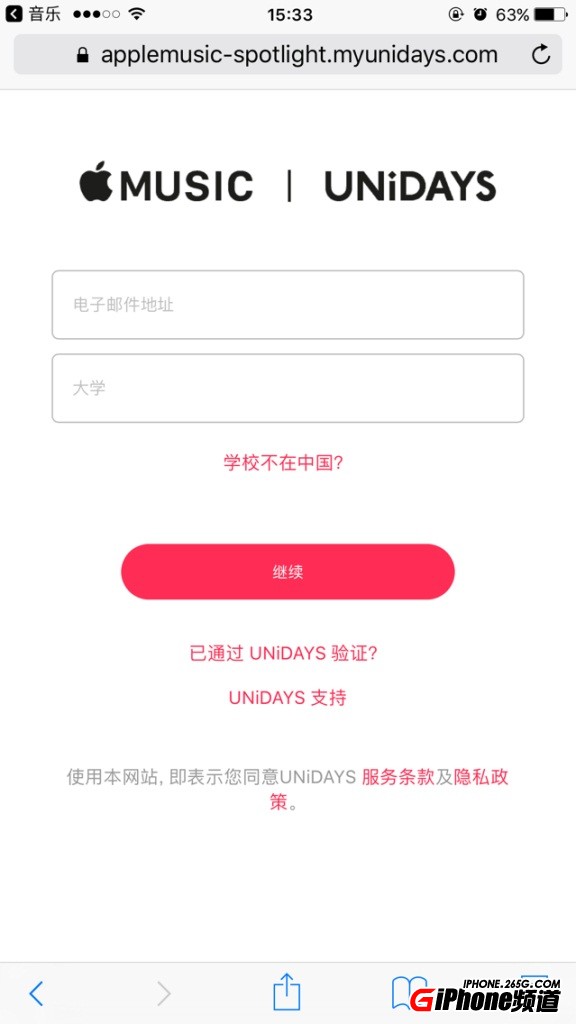 2.輸入你的Apple ID和學校名稱(可以隨便填一個),點“繼續”進入你在哪個學校頁面,然後點擊UNiDAYS支持,點擊“無法找到學院”,之後填寫自己的名字、姓氏和學院名稱,電子郵件地址那兩行不需要填,點擊提交。兩天內你會收到 UNiDAYS 的郵件。