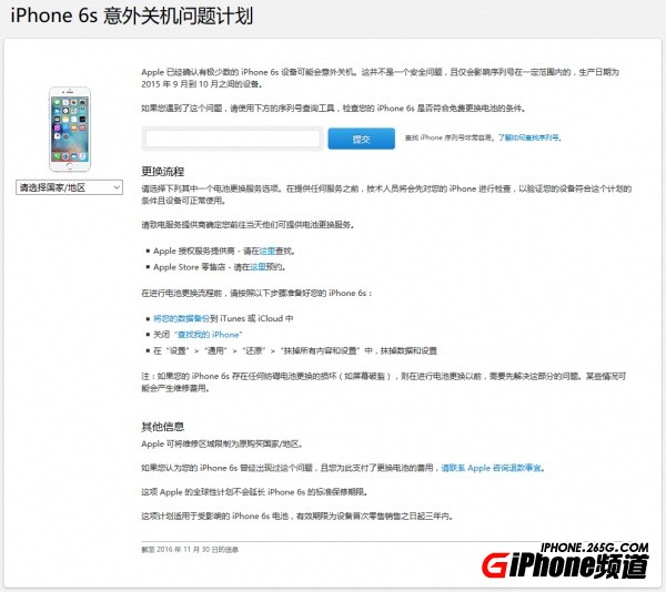 iPhone6s電池查詢工具地址_iPhone6s電池更換條件查詢 今天蘋果官網的《iPhone 6s意外關機計劃》頁面更新了一個小工具,用戶可以輸入自己手機的序列號來查詢生產日期,進而確定手機是否具備免費更換電池的條件。