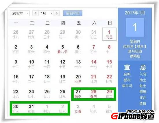 2017年1月27日至2017年2月2日調休,放假7天