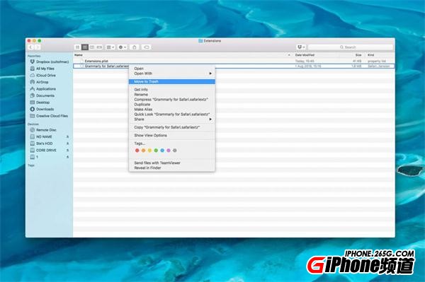 4. 像刪除其他文件一樣刪除擴展程序,我們可以右鍵點擊並選擇“移到廢紙簍”,或者直接將該文件拖到廢紙簍圖標上即可刪除。