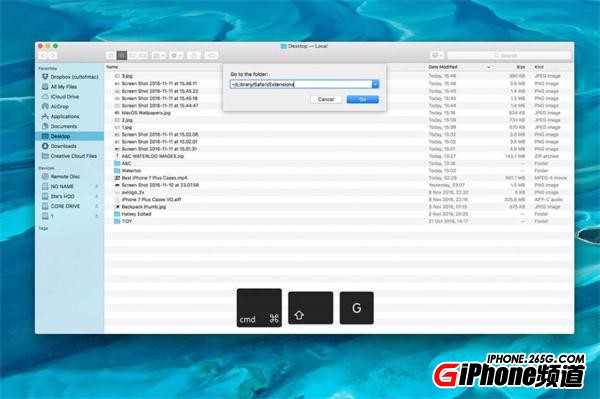 3. 如果上述方法無效的話,我們還可以選擇手動刪除擴展程序。打開Finder,並且使用Command + Shift + G這個組合按鍵,並在彈出的窗口中輸入“~/Library/Safari/Extensions/”這個路徑,找到想要刪除的擴展程序。