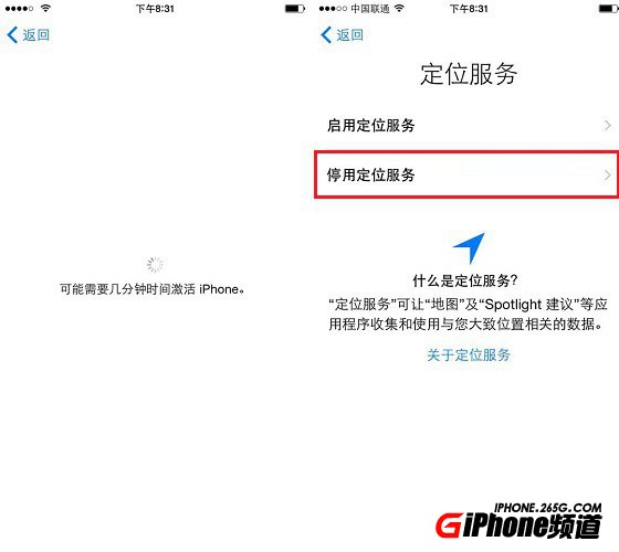 第四步,網絡連接成功後,系統會提示需要幾分鐘來激活iPhone。結束後會進入新的初始化設置界面。我們首先要確定定位服務,這裡建議選擇【停用定位服務】,之後我們可以在【設置】自行修改。