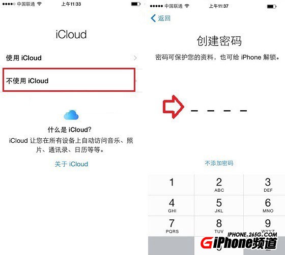 第八步,Apple ID設置完成之後,接下來進入到iCloud設置界面。這裡直接點擊『不使用iCloud』。隨後需要創建密碼,這裡提醒一下,iOS9系統之後變成了6位數字密碼,而不是4位。