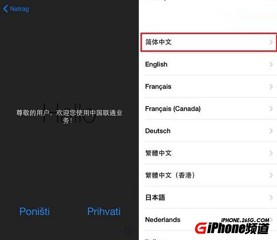 第一步,首先給你的iPhone7安裝Nano-SIM卡,安裝後按下電源鍵開機,開機後你會看到一個運營商網絡歡迎界面,點擊接受進入語音選擇界面,在國內我們當然選擇【簡體中文】。