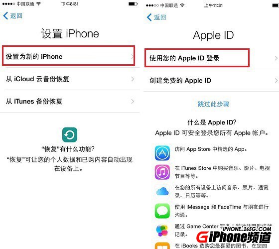 第五步,接下來是設置iPhone界面,考慮到這是新的iPhone7,建議大家選擇【設置為新的iPhone】。隨後進入到Apple ID輸入登錄頁面,如果你已經有蘋果ID直接點擊【使用您的Apple ID登陸】,如果你還沒有蘋果ID,那麼就點擊『創建免費的Apple ID』,記住蘋果ID是非常重要的賬號和密碼,切記要記住,如果忘記了也一定要記得你的郵箱注冊。