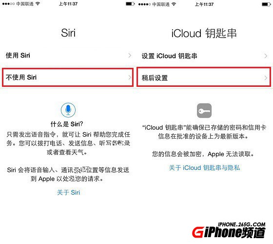 第十步,接下來的設置都選擇否定或稍後的選項即可,如接下來的Siri和iCloud秘鑰串設置中,直接選擇【不使用Sari】和【稍後設置】即可,如圖所示。