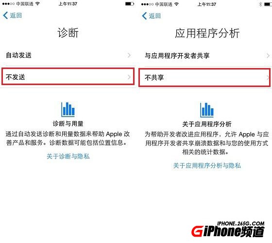 第十一步,同樣的道理,在診斷和應用程序分析設置中,我們還是直接選擇【不發送】和【不共享】即可,如圖所示。