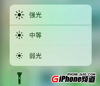 手電筒的亮度調節需要支持3D Touch功能的iPhone才能使用,使用方法很簡單,重壓手電筒圖標,就可以選擇強光或者是弱光了。