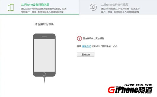 請將蘋果設備,通過數據線連接到電腦上,互盾蘋果恢復大師會檢測蘋果設備並連接。成功連接後,點擊"開始從iPhone中恢復數據".