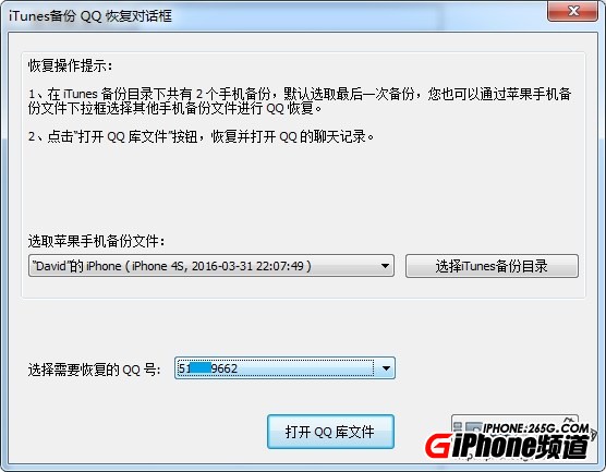 在“iTunes備份QQ恢復”對話框中,如下圖點擊“打開QQ庫文件”按鈕,就能查看需要恢復QQ號的聊天記錄了。如果有多個QQ號,可以通過QQ號的下拉框進行選擇。