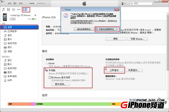 (5)、點擊“不備份應用程序按鈕”。備份一般時間不會太長,請耐心等待。上面藍色進度條到達尾部就表示結束了,備份成功後會在“立即備份“按鈕的下方顯示最新的備份時間。
